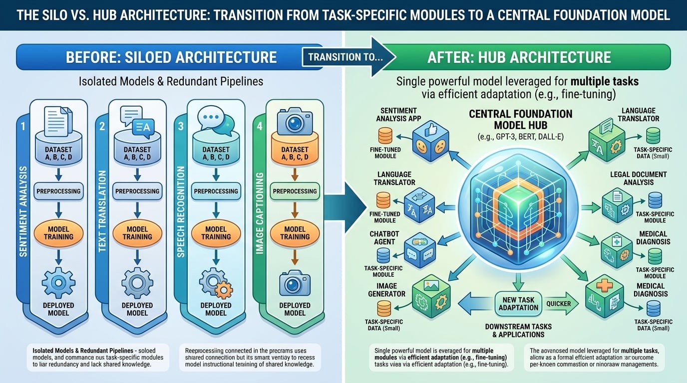 - IA Fragmentada: Uma era definida por arquiteturas neurais discretas e especializadas projetadas para tarefas individuais, como rotulagem de sequências ou classificação.